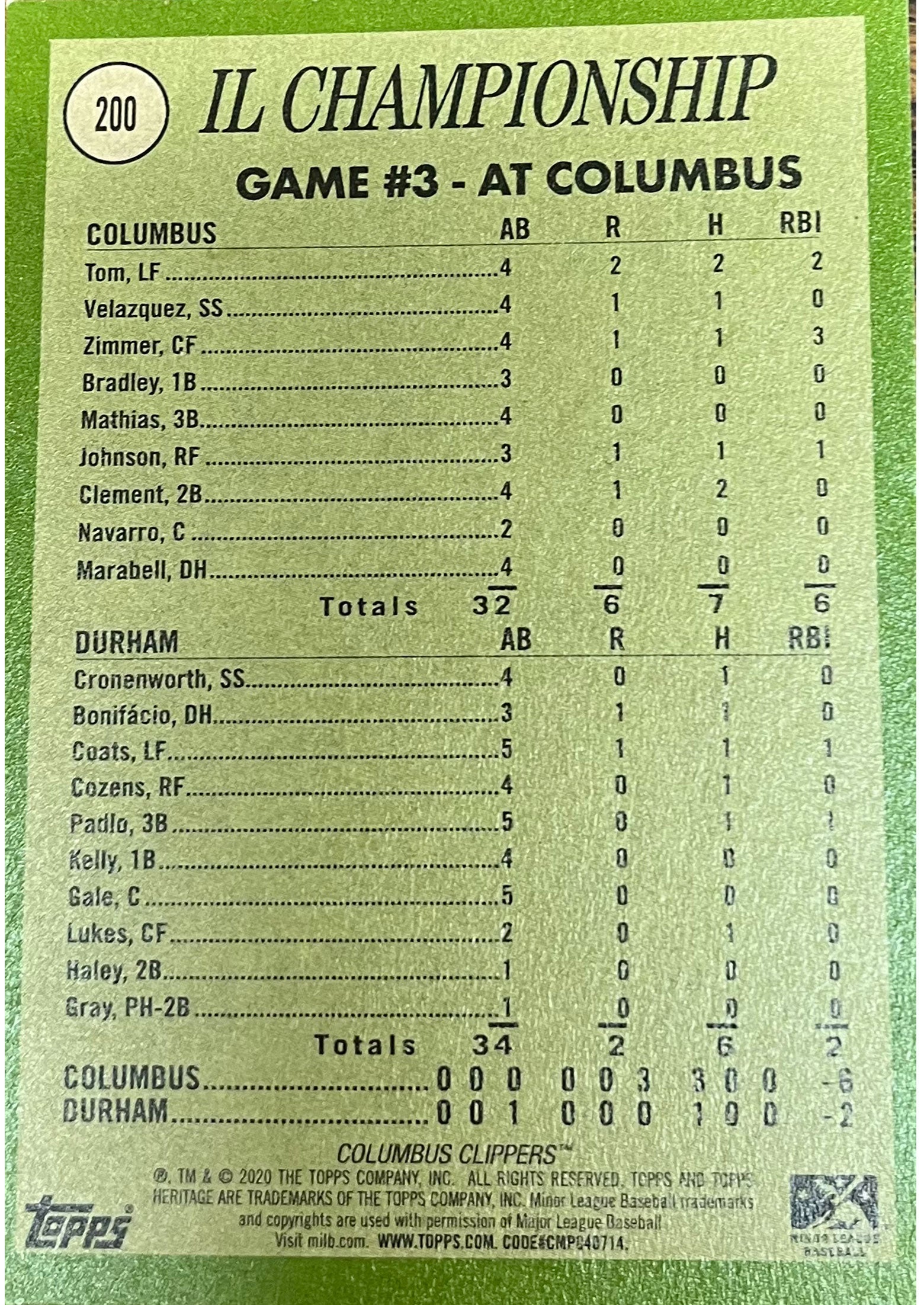 This 2020 Topps Heritage IL Championship #200 Card has been hand signed by Bradley Zimmer. This item comes straight from Bradley's closet and is LMC Authenticated.