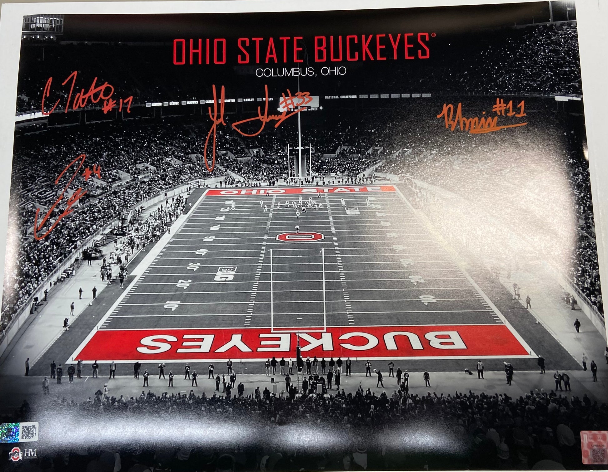 Jack Sawyer, Julian Fleming, Carnell Tate, Brandon Inniss Autographed 16X20 - B/W Ohio State Stadium